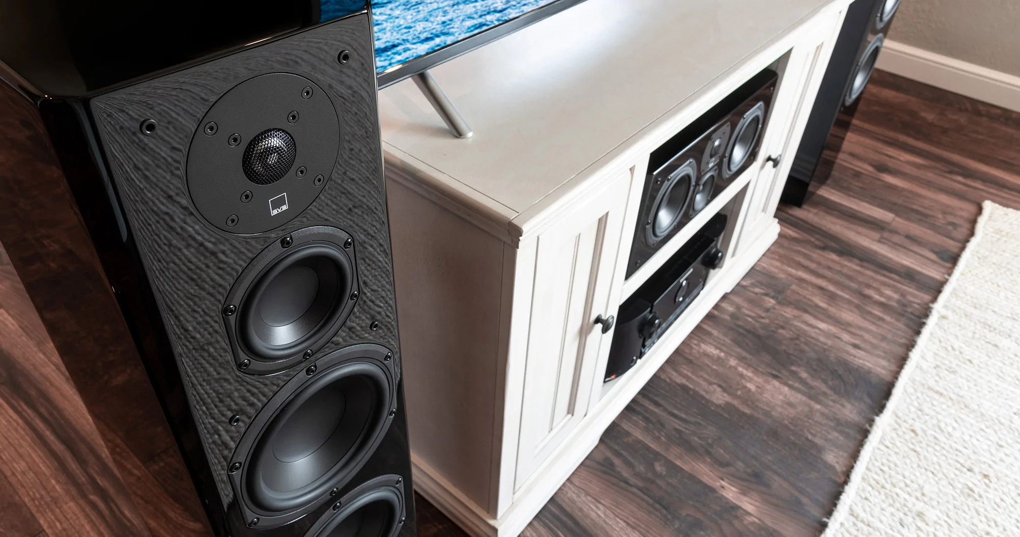 The 4.5-inch midrange drivers are designed for excellent acoustic performance and are individually located inside the enclosure in a sealed compartment. SVS chooses this suspension of the driver to put down a very clear and accurate midrange without any coloration of the sound. The material from which the cone is made is also extremely light and has high rigidity, creating a crucially flat frequency response. In addition, the dual 6.5-inch woofers provide a deep and expressive bass response that emphasizes the impact of instruments bass lines and sound effects. Both woofers have separate internal compartments in the enclosure with their own frequency for tuning the bass reflex port. The result is deep, powerful and accurate bass that you both hear and feel. At the very top of the Prime Tower is the 1-inch aluminum dome tweeter that boasts the right degree of rigidity, efficiency and lightness to produce crisp highs.